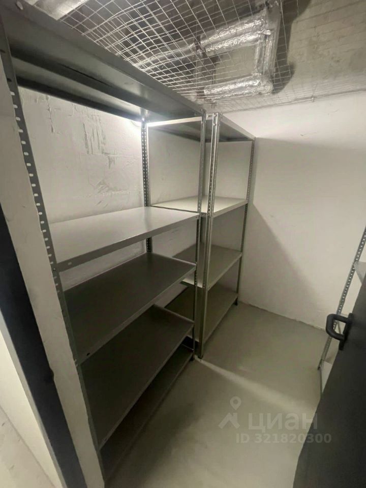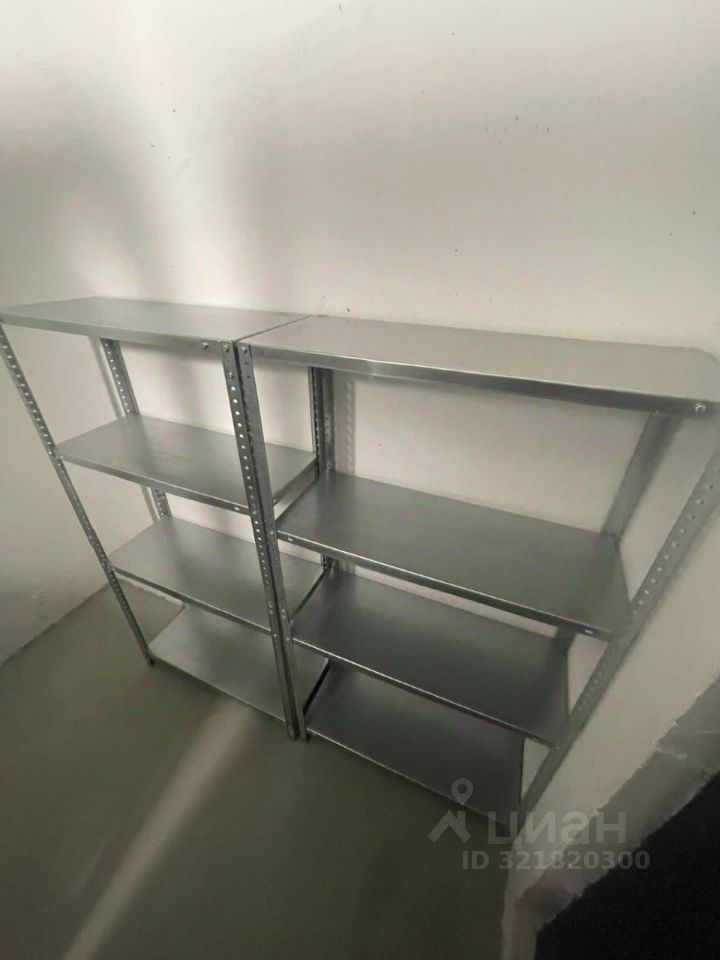 Кладовая оборудована Светильником, стеллажами 4шт, и столом.