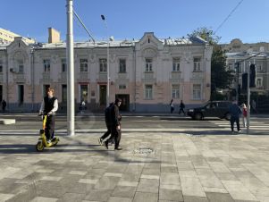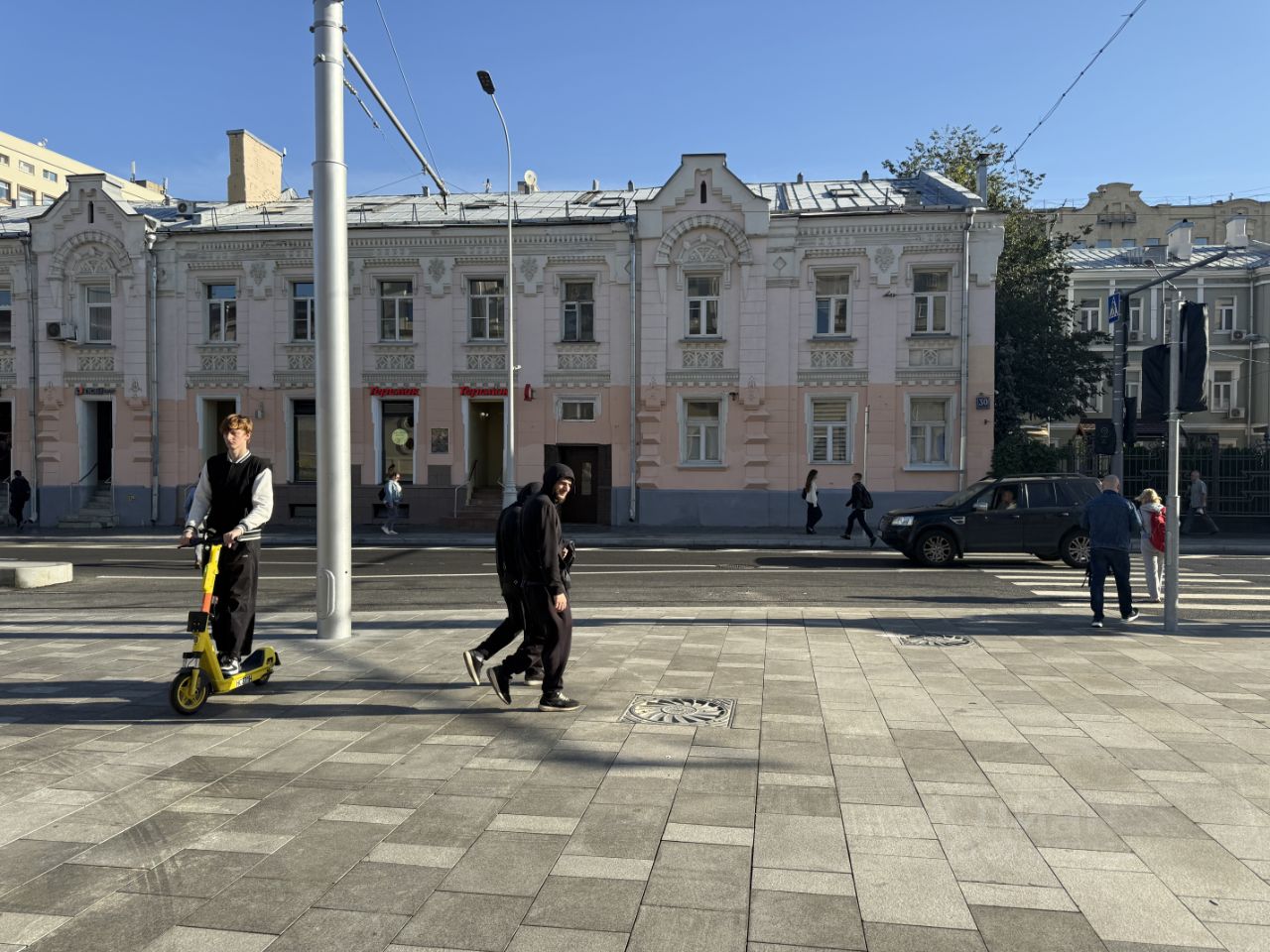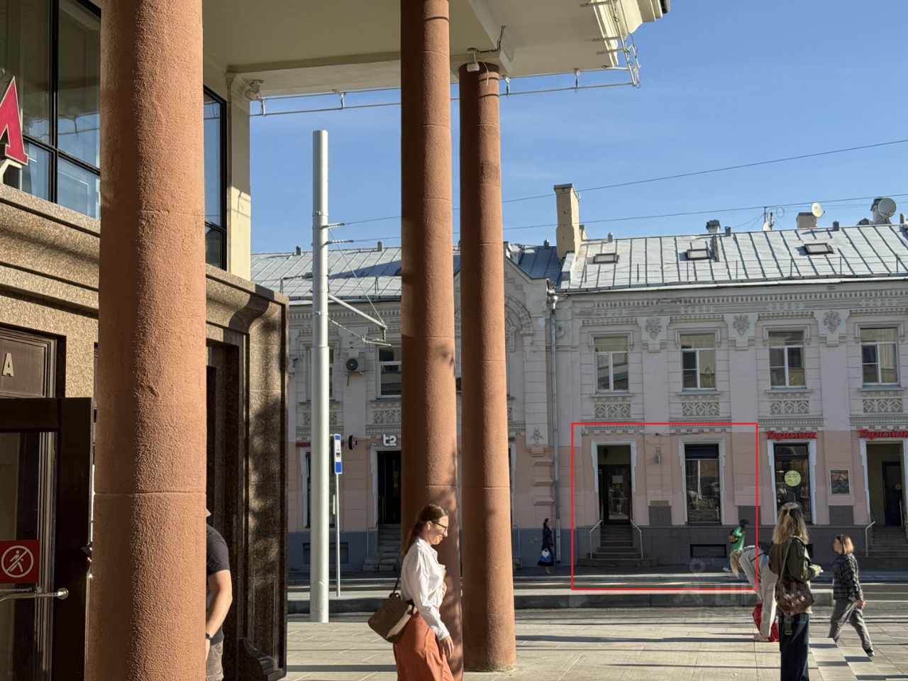 Первая линия домов, прямая видимость от метро Чистые пруды, напротив пешеходный переход, трамвайная остановка.