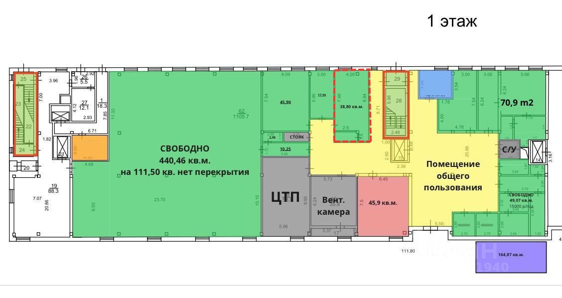- Общая площадь 38,8 м2 (возможно арендовать метраж больше или меньше)