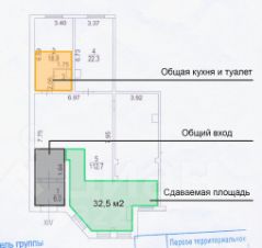 Предлагается в аренду часть нежилого помещения свободного назначения на 1 этаже жилого дома. Общая площадь - 32,5кв.м
