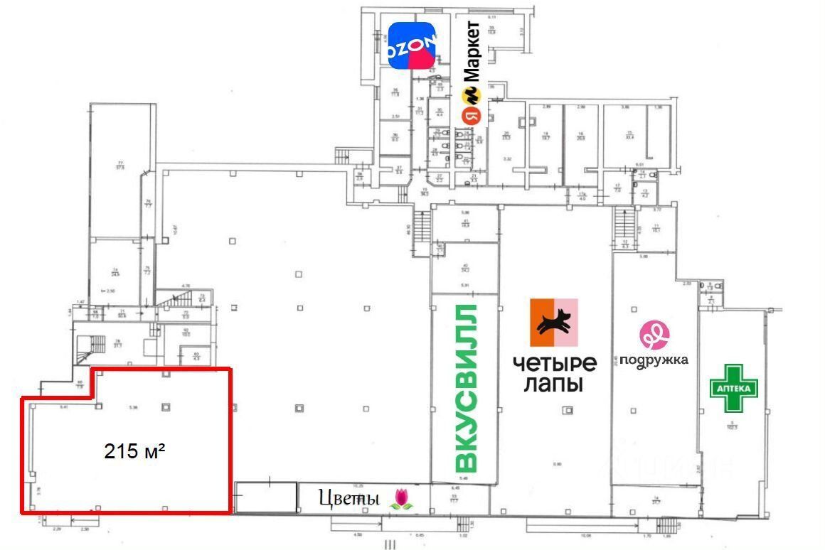 Арендаторы рядом: Вкусвилл, Четыре Лапы, Подружка, Неофарм, Цветы, Озон, Яндекс Маркет.