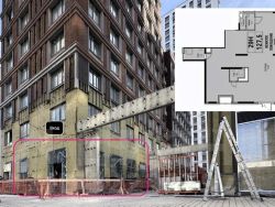 . Угловое ровное помещение рядом с торговым стилобатом,торец секции у проходной арки.