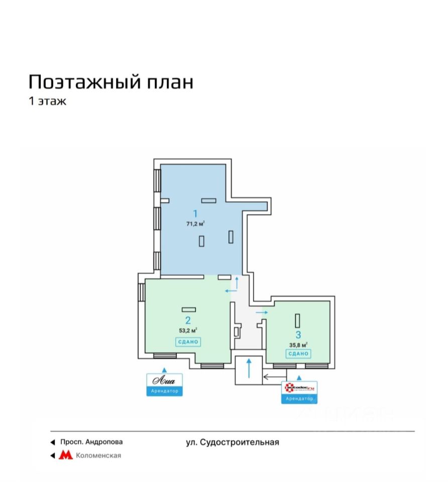 Аренда от Собственника! Сдается в аренду помещение свободного назначения, площадь 71,2 м2, расположенное на 1 этаже жилого дома. Общий вход с улицы. Густoнаселенный жилой район со сложившейся инфраструктурой. Интенсивный пешеходный трафик, от метро Коломенская 2 минуты пешком. Помещение без отделки. Высота потолков 3.5 м. Арендные каникулы обсуждаются.