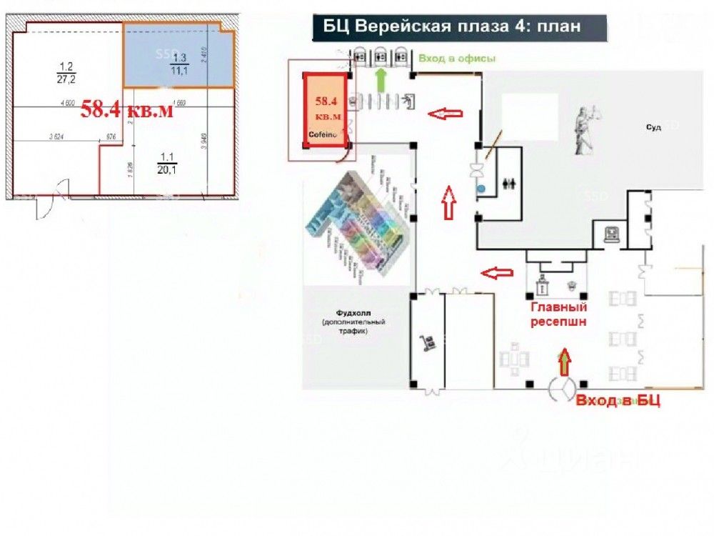 Общая площадь 58,4 кв.м., 1 этаж, торговая галерея после зоны ресепшн. Отдельный вход. Витринное остекление в пол. Потолки 3,4 м. Электрическая мощность 22 кВт. Помещение с ремонтом. Круглосуточная охрана здания. Наземная парковка. В настоящее время помещение занимает арендатор кафе на краткосрочном договоре аренды.