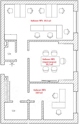 В кабинете 3 (18,9 м²) остается старый арендатор. Аренда кабинета 1 в субаренду, включая переговорку и общие места пользования.