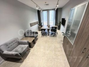 В помещении стандартная офисная отделка, кабинетная планировка (поставлена перегородка, которая разделяет офис на две секции), с мебелью. В стоимость включено: сервис и обслуживание, интернет, пользование инфраструктурой (в том числе 5 этаж) и переговорными комнатами (10 часов в месяц). Окна выходят во дворик. Центральная система кондиционирования и приточно-вытяжная система вентиляции. Подземный паркинг.