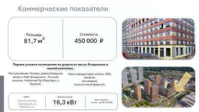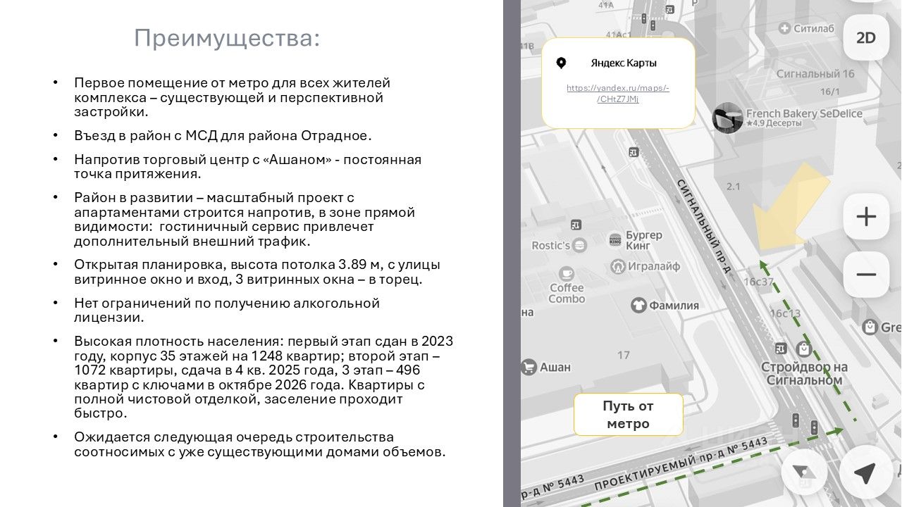 •Район в развитии масштабный проект с апартаментами строится напротив, в зоне прямой видимости: гостиничный сервис привлечет дополнительный внешний трафик.