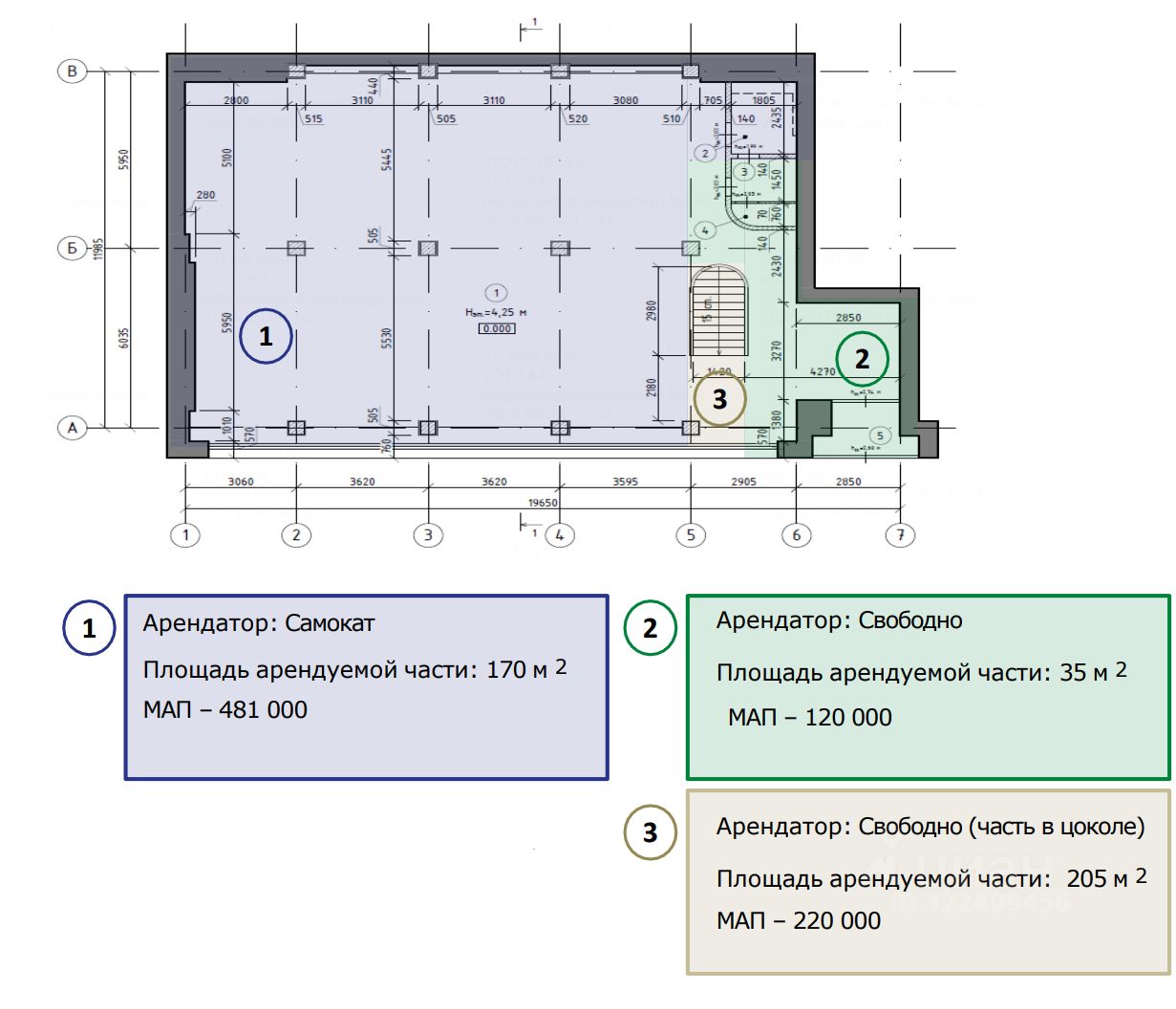 - Общая площадью: 205 м2. (часть входа на 1 этаже, 7 м2, 198 м2 цоколь)
