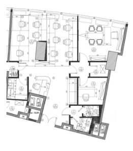 Параметры планировки: 2 кабинета, open space (рабочая зона), гардероб, 2 санузла, кухня.