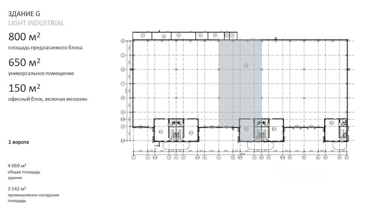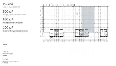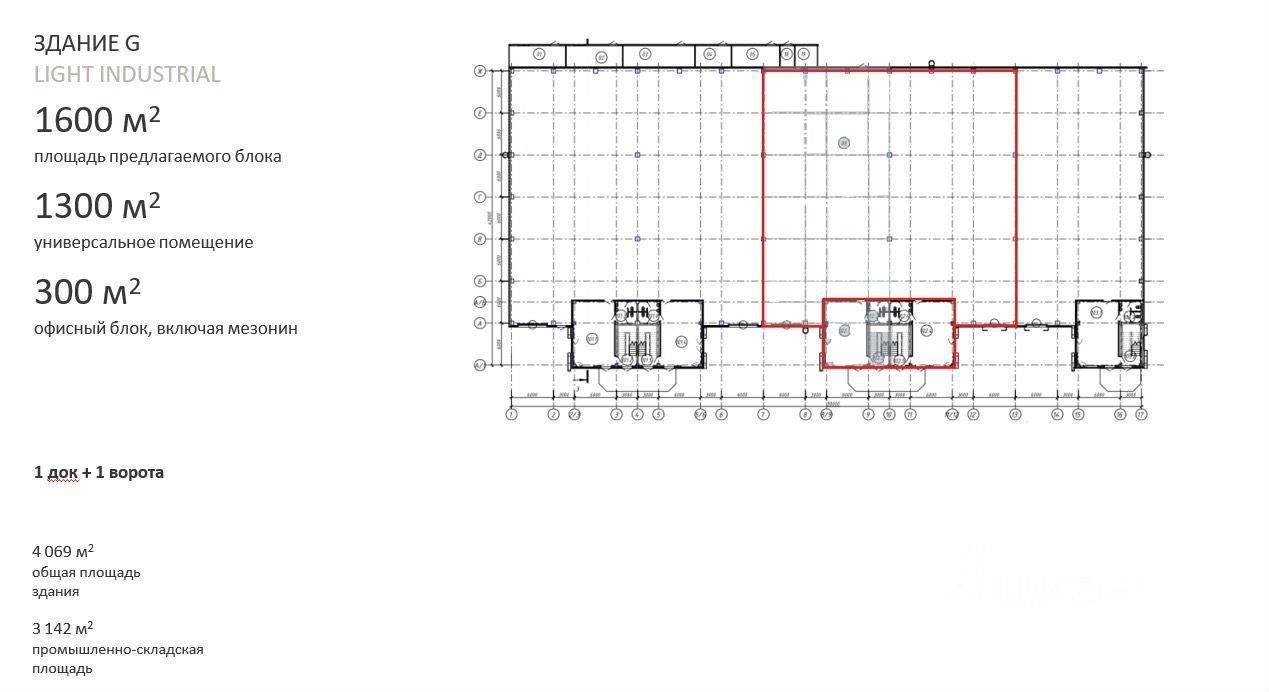 Помещение общей площадью 1600 м2 в здании G состоит из универсального промышленно-складского блока - 1300 м2, двухэтажной офисной части - 300 м2 Количество ворот на нулевом уровне от земли 2. Количество легковых и грузовых парковочных мест, включенных в стоимость, зависит от площади помещения.
