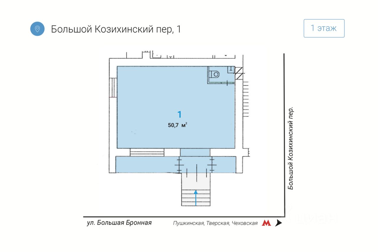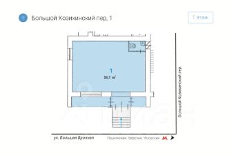 Премиальное расположение: Помещение расположено на 1-м этаже жилого дома на пересечении двух ключевых улиц — Большой Бронной и Большого Козихинского переулка.