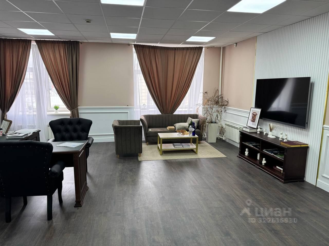 Просторная планировка и большие окна делают помещение светлым, уютным и универсальным — подойдёт под офис, кабинет специалистов, шоурум или студию.