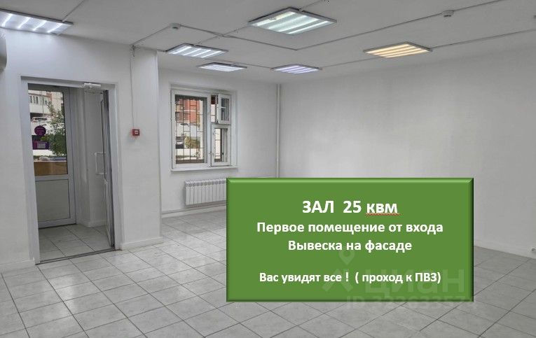 Предлагается светлое помещение 26 кв м , первое от входа , отлично подходит под услуги и торговлю