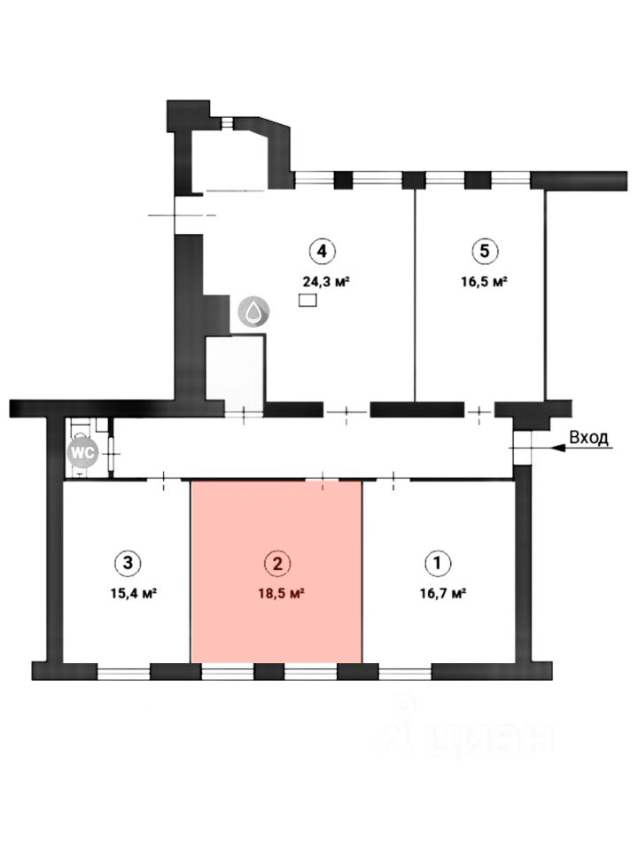 Помещение 2 (см.планировку). Площадь 18,5 м2. Высота потолка 3,1 м. Новый ремонт (обои под покраску, натяжной потолок, встроенные светильники, напольное ламинатное покрытие, стильная дверь). Кондиционер. Два окна выходят в тихий переулок. Скоростной интернет. Доступ 24/7.