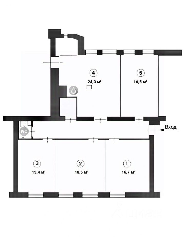 Высота потолков помещений 3,1 м. Площади кабинетов 16,7 м², 18,5 м², 15,4 м², 24,3 м², 16,5 м². Входы из общего коридора. Есть также техническое темное помещение (серверная) и санузел. Только что сделан новый ремонт - обои под покраску, натяжной потолок, встроенные светильники, напольное ламинатное покрытие, стильные двери. Кондиционеры. Центральное отопление. В помещении 4 (см.планировку) есть возможность вывода мокрой точки. В этом же кабинете есть темная комната и технический выход во вдор. 4 окна выходят в тихий переулок и 4 окна во двор. Скоростной интернет. Доступ 24/7.