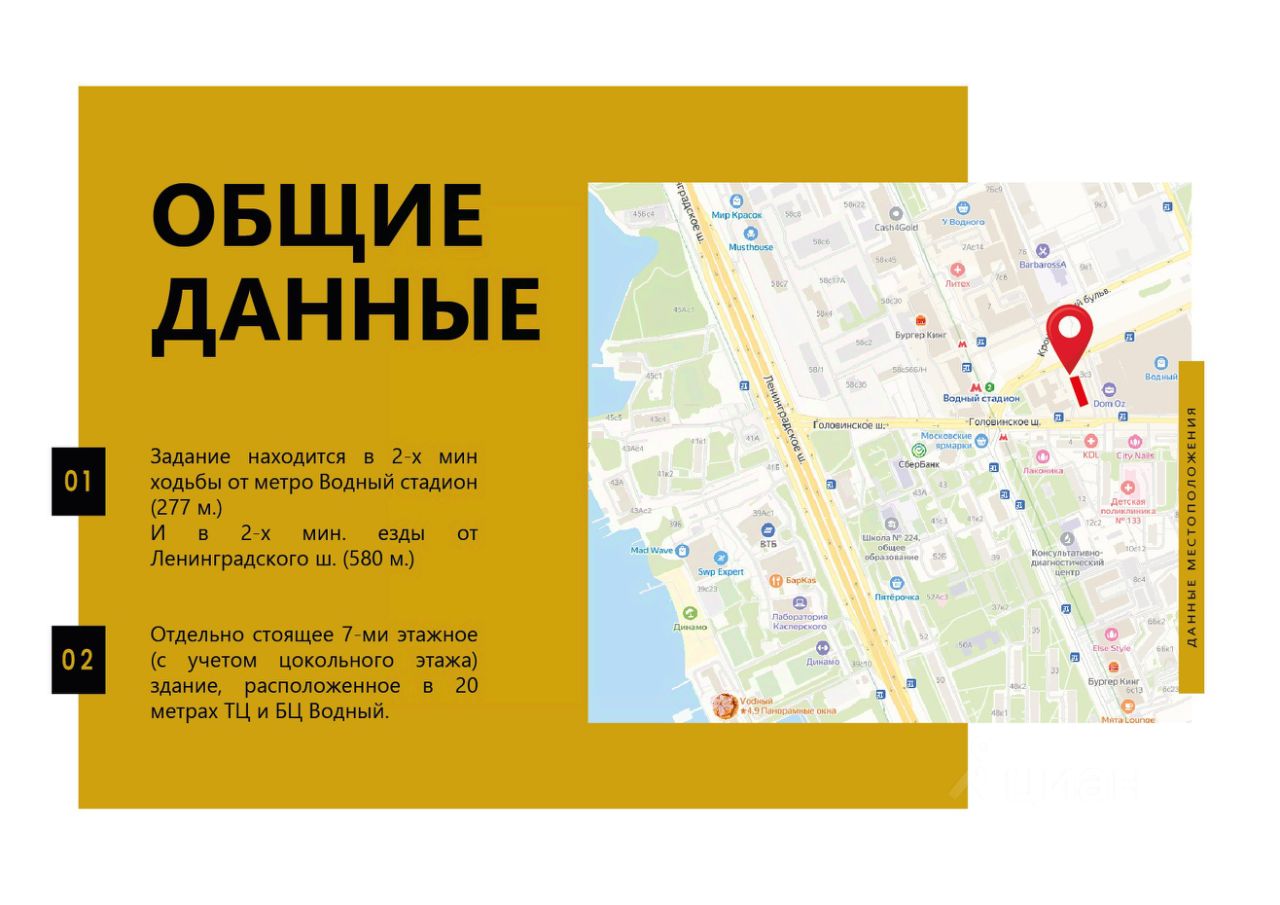 Сдается помещение с панорамными окнами на 1 этаже под ресторан кафе столовую в бизнес центре "Флагман". Сам бизнес-центр имеет 7 этажей (с учетом цоколя) Напротив расположен, в 20 м., ТЦ и БЦ "Водный". Наш бизнес-центр находится в 2-х мин ходьбы от метро Водный стадион (277 м.) и в 2-х мин. езды от Ленинградского ш. (580 м.) 4 отдельных входа (Два с лицевой стороны, одно с торцевой и одно со обратной стороны) Выполнен качественный ремонт в стиле лофт от предыдущего арендатора. Год ремонта 2024 г. Оборудование не входит в стоимость аренды, так как его забирает предыдущий арендатор. Имеется подводы ХВС, ГВС, центральное отопление. Подключена вентиляция, выделенная мощность 70 кВт. Высота потолков 4,1 м. до межэтажного перекрытия, 3,8 м. до ригеля.