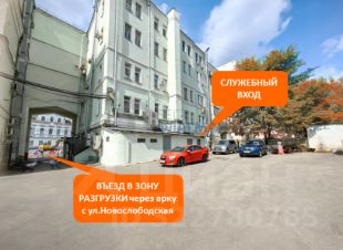 В помещении сделан хороший ремонт, широкая витрина, высокие потолки 3 метра, электрическая мощность 40 кВт, есть вытяжка, которая расположена выше кровли, круглосуточный доступ, наземная парковка, отдельный вход с ул. Новослободская и со двора. Можно вешать вывеску.