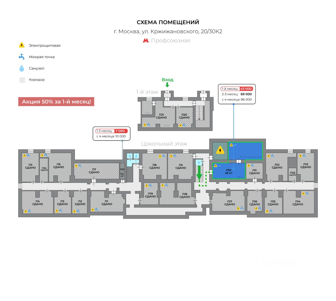 Похожие помещения на этом адресе сданы под пункты выдачи заказов, офисы, склады, услуги красоты, кофейню и юридические услуги населению.