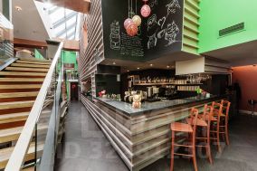 2-х уровневое фасадное панорамное остекление зала, прекрасно оборудованная входная группа с атриумом.