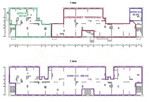 Предлагается в аренду помещение на 1-м этаже с ремонтом, в 70 м находится вход в супермаркет "Пятёрочка" (Блок 2 на плане с крупными блоками):