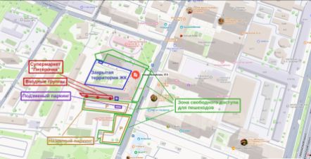 Объект имеет 3 выходные группы, соединяющие 1-й и 2-й этажи, одна из которых располагается рядом со входом на закрытую территорию ЖК, рядом с въездом на подземную парковку и напротив наземной парковки (вход в супермаркет "Пятёрочка, к прикассе и на 2-й этаж). Остальные 2 входные группы находятся в 40 и 70 м от входа в супермаркет "Пятёрочка", располагаются напротив наземной парковки (последний вход расположен рядом с детской площадкой).