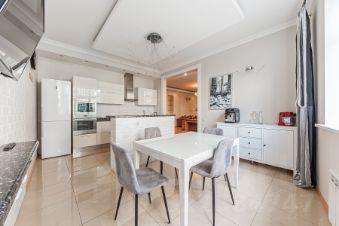 Функциональная планировка: общая зона, кухня-столовая, 2 кабинета, гардеробная комната и СУ с ванной-джакузи, 1 СУ с душевой кабиной, лоджия, терраса, постирочная-хозяйственная комната, холл с гардеробным блоком. Возможен вывоз мебели. Встроенная кухня укомплектована всей бытовой техникой лучших европейских производителей. Стильный дизайнерский ремонт. Подземный паркинг, имеется 1 машиноместо.