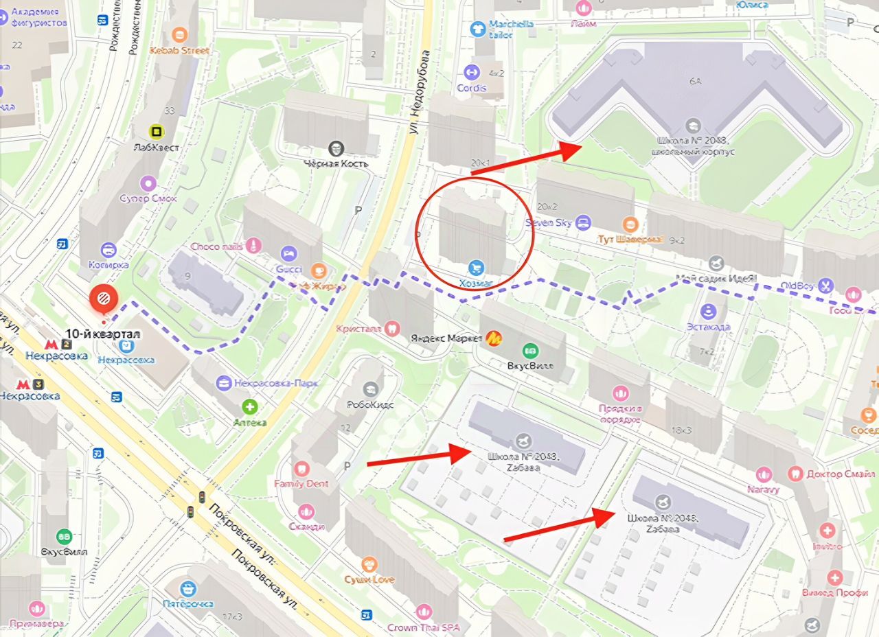 Дом оптимально расположен в самом центре ЖК. До ст метро Некрасовка — 4 минуты пешком. Прямо мимо дома проходит народная тропа от метро в 13 квартал, в котором ещё порядка 4000 квартир. (смотрите скрин с Яндекс-карт). В 17:00 — интенсивный пешеходный трафик 2100 чел в час.