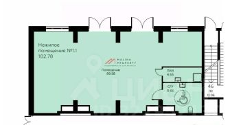 Помещение 102,8 м2 располагается на 1 этаже, открытая планировка, два входа, высота потолка 4,6 м, витринные окна по фасаду. Парковка перед фасадом. Место для размещения рекламы на фасаде. Электрическая мощность 20 кВт.