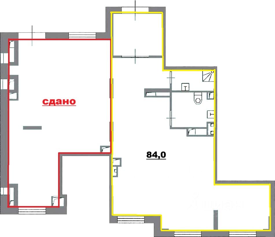 Сдаётся часть помещения площадью 84 м2 на длительный срок помещение свободного назначения. Помещение располагается в новом жилом доме, зальная планировка, отдельный вход, высокие потолки 4,4 м. Арендные каникулы обсуждаются