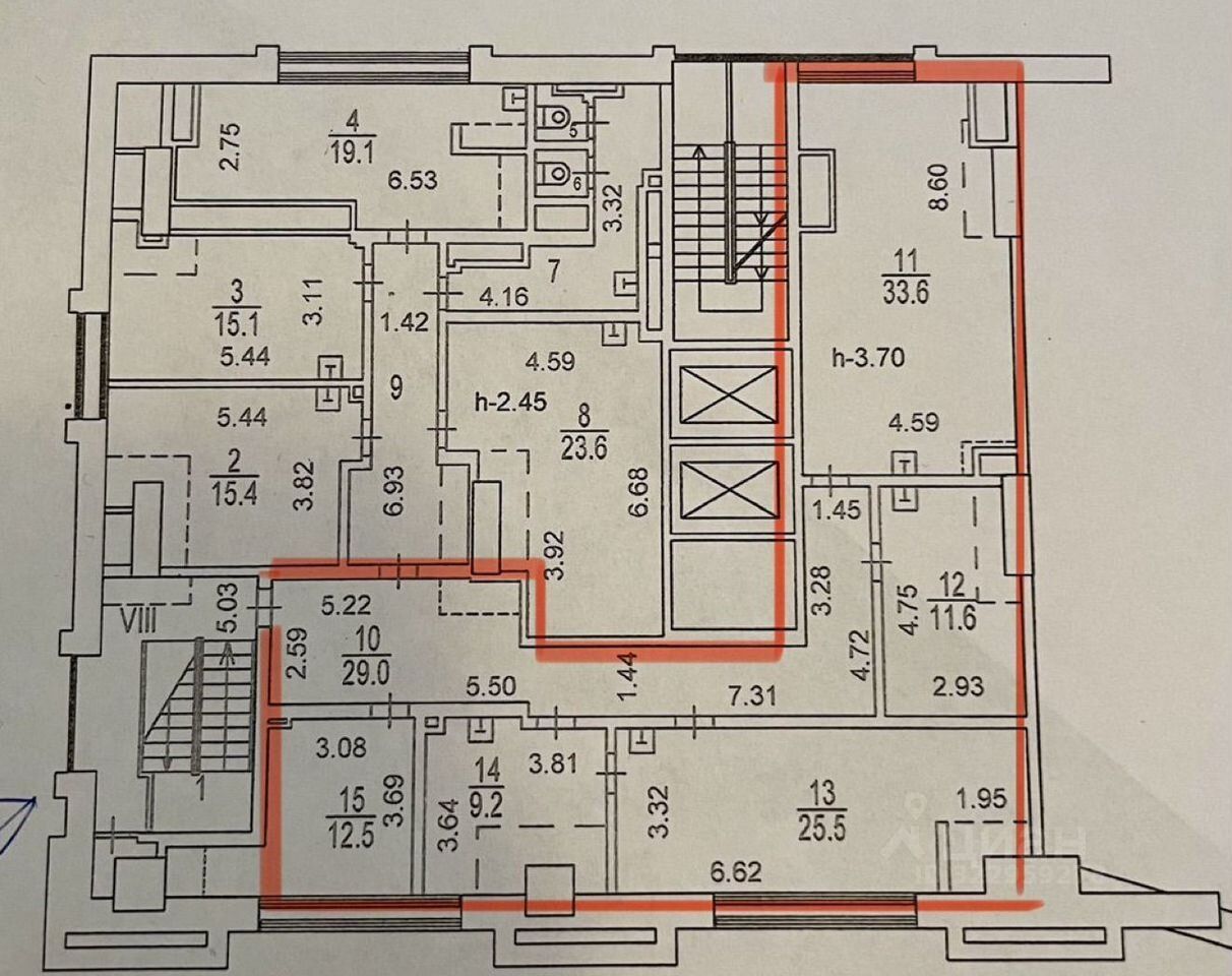 Кабинетная планировка, в каждом кабинете мокрая точка.