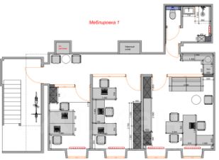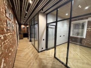 3. Планировка - Офис разделён на три полноценных изолированных кабинета с возможностью расположения до 10 - 12 рабочих мест. Высота потолков более 3 метров.