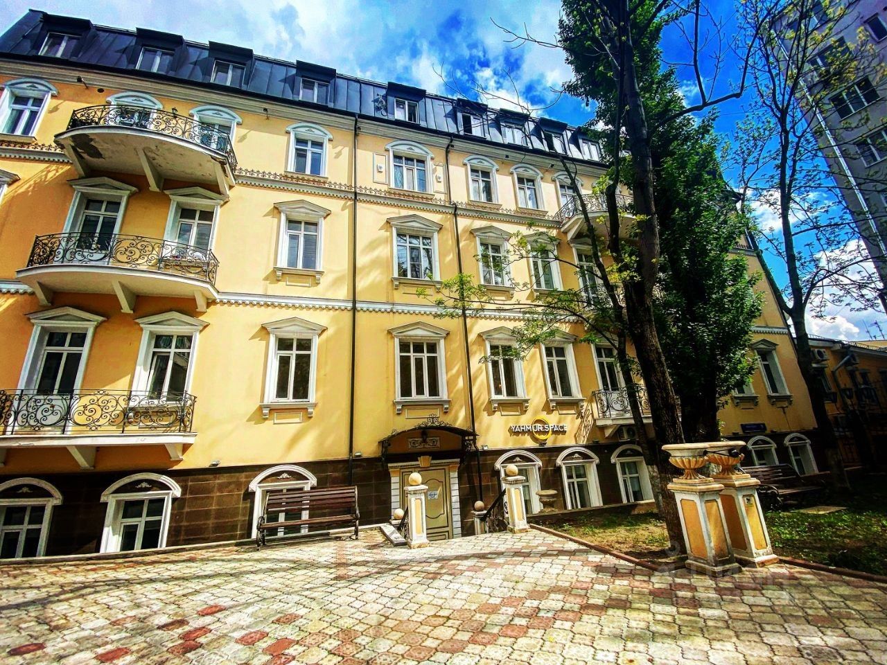 Собственный благоустроенный двор с садом, деревьями и скамейками.