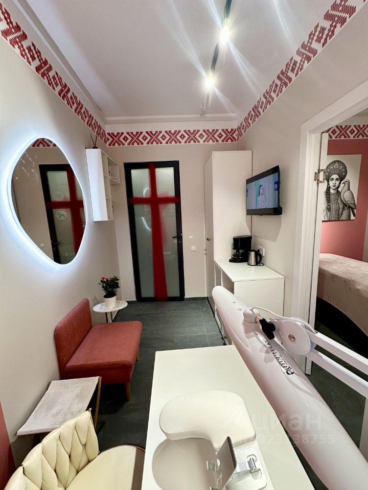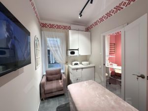 Мебель: кресло, столик кофейный, кушетка, зеркало, лаборатория красоты с раковиной, стул мастера, коврик для клиента, светильник, корзина для мусора.