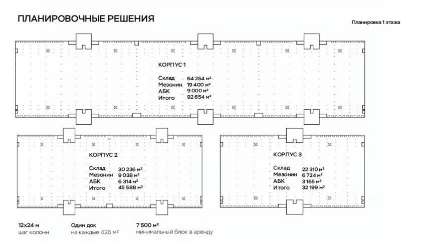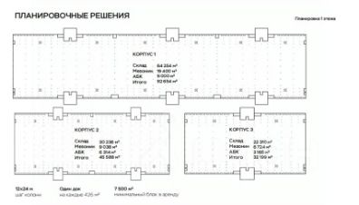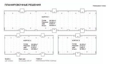 Предлагаются под аренду блоки от 7500 кв.м. до 170000 Предварительный договор аренды (ПДА): 3 месяца Арендной платы. Долгосрочный договор аренды (ДДА): 2 месяца Арендной платы. Депозит, оплаченный в рамках ПДА, может быть частично зачтен в счет Арендной платы по ДДА. Индексация согласно ИПЦ, но не менее 10 % в год. 12 м рабочая высота в зоне склада. Бетонные полы с антипылевым покрытием. 5,6 м рабочая высота мезонина. Мезонин и встроенные блоки АБК. Автоматические ворота Hrmann c герметизаторами и уравнительными платформами. Один док на каждые 426 м². Кросс-док. Указана средняя ставка.