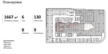 6 этаж. VIP блок 1667 кв.м: 8 кабинетов, гардеробная, 9 переговорных, вип-зоны, мини-кухня, кофе-поинт, зоны отдыха и серверная.