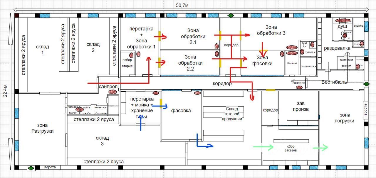 Система видео наблюдения по периметру, интернет волокно. Мокрые точки, сливы в полах.. Имеется зоны загрузки, разгрузки, исключающие пересечение потоков сырья и готовой продукции.