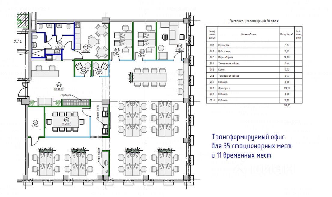 Планировки офисных этажей соответствуют всем современным требованиям функционального офисного пространства, офис 272,2 м² на 20 этаже с постоянным размещением порядка 40 сотрудников. Увеличенная площадь остекления обеспечит оптимальный уровень инсоляции, открытый панорамный вид на Москву с высокого этажа.