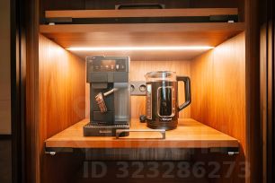 - 2 кофе машины на выдвижной полке с подсветкой для удобства использования (эспрессо, американо, каппучино, флэт-вайт итд)