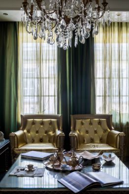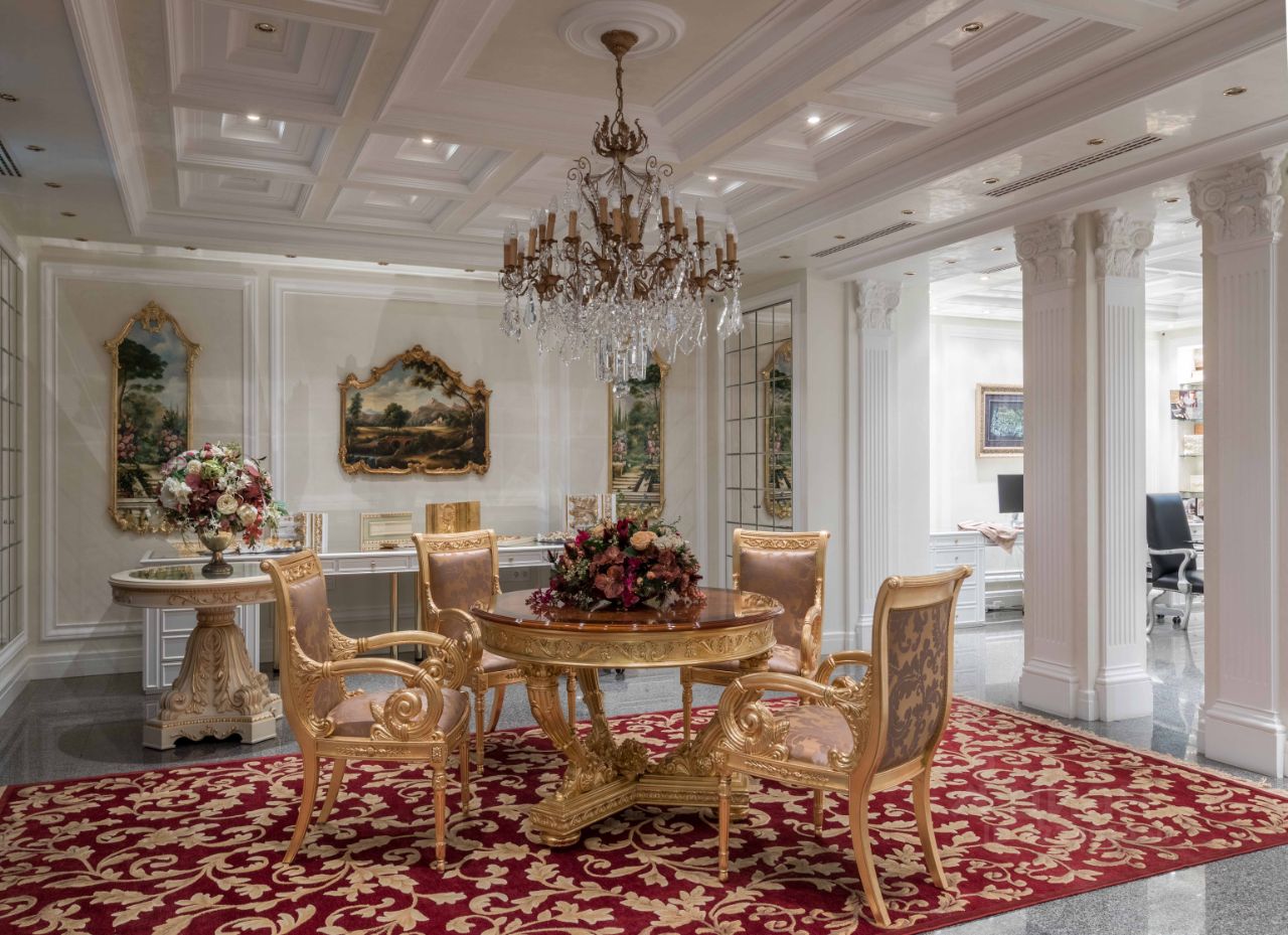 В холлах мраморные лестницы, кованые перила с причудливом узором.