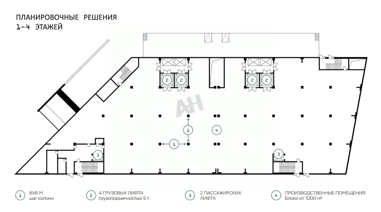 Свободная планировка, потолок 8 метров, колонны 8х8 м, пол бетон-антипыль, нагрузка 720-1200 кг/м2, 4 грузовых лифта (5 тонн), 2 пассажирских лифта. Пандус (+0,9м) 80 м, автоматические секционные ворота. Подземный этаж для отгрузки с прямым доступом курьерского автотранспорта. Электроснабжение 2 МВт, II кат.