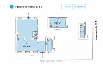 Помещение находится на первом этаже и антресоли дома, в шаговой доступности от метро "Проспект Мира" - 2 минуты пешком.