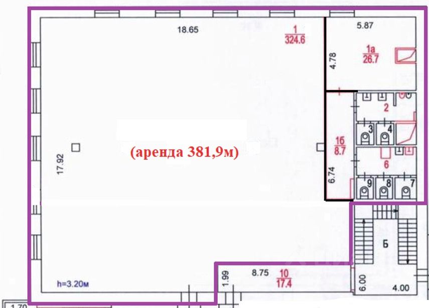 Помещение 381,9 кв.м. на 1 этаже. Рассматривается под различные виды деятельности. Открытой планировки (см.план). Свои с/у. Помещение после спортзала. Без оборудования. Прямая аренда. Ставка указана с учетом коммунальных услуг. УСН. Депозит 1 месяц. Налоговая 22. Своя огороженная территория. Возможность арендовать м/м.