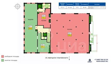 Состояние помещения: с ремонтом, за выездом арендатора - РЕСТОРАН. Арендные каникулы. Оперативный показ. В арендную ставку включен НДС. ВОЗМОЖНОЕ ИСПОЛЬЗОВАНИЕ: свободное назначение, ресторан/кафе.