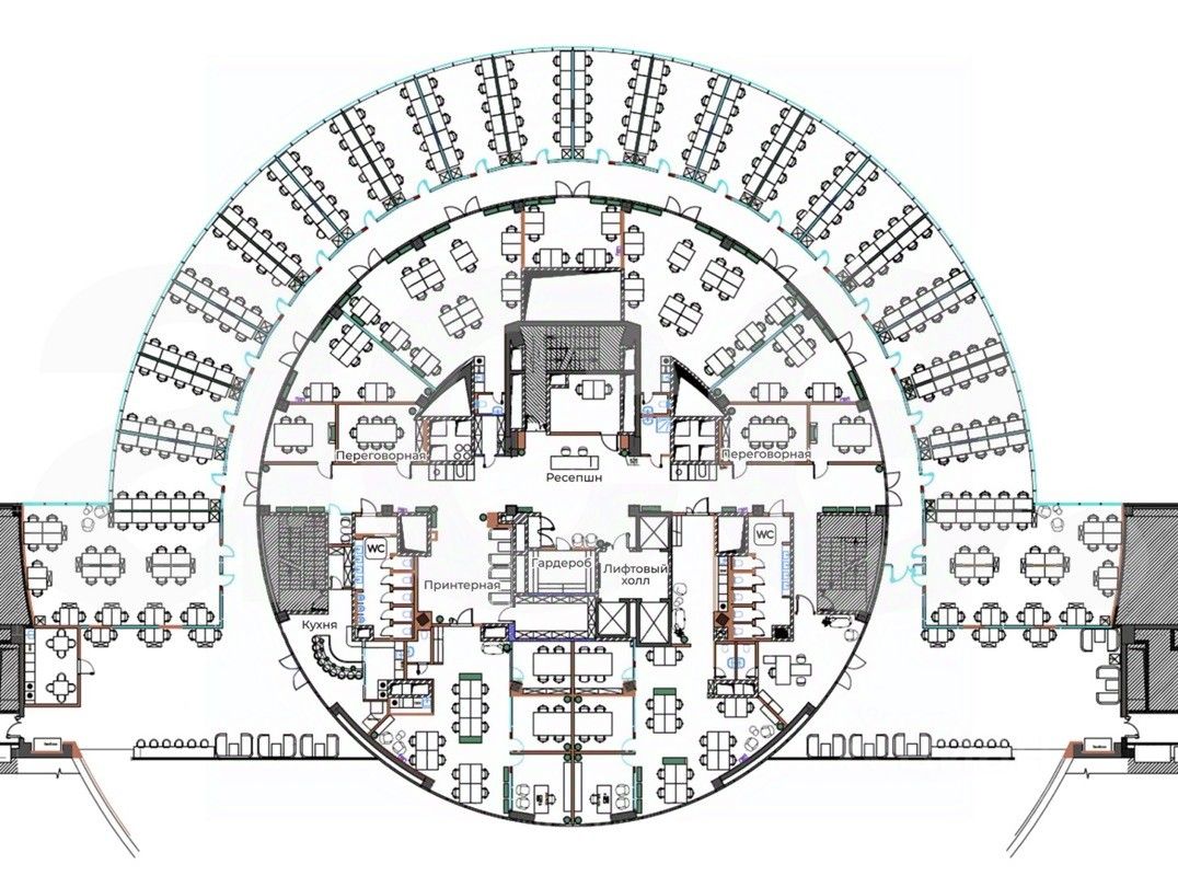Зонирование включает ресепшн, рабочие места, кабинеты, переговорные, зоны отдыха и кафе.