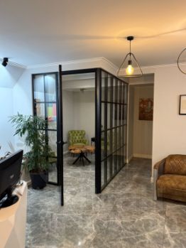 Площадь - 58,8 м². Первый этаж. Отдельный вход со двора. Свой санузел. Установлена стеклянная межкомнатная перегородка с дверью. Мебель на фото может быть передана новому арендатору.