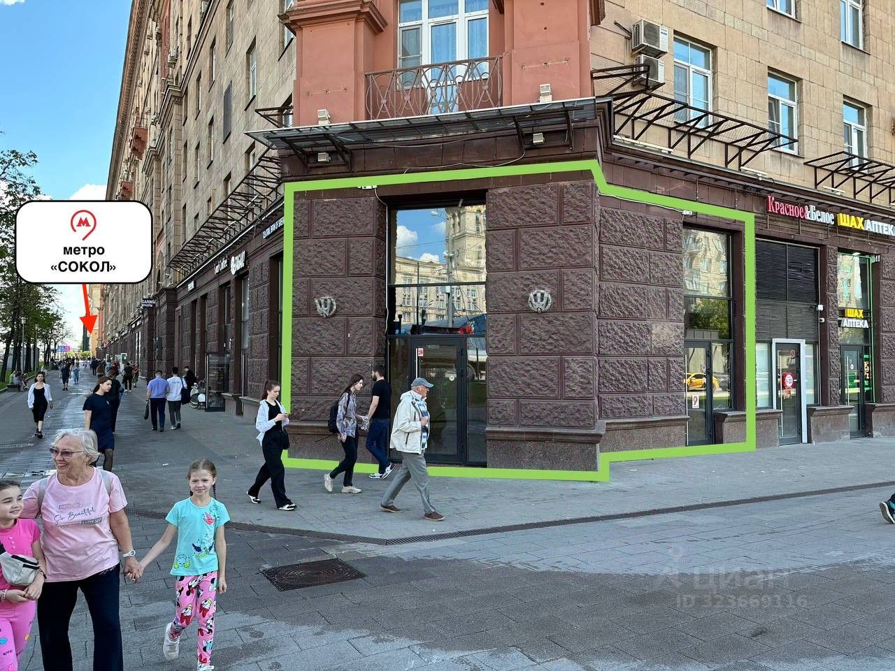 Сдается торговое помещением у метро на 1-й фасадной линии м. Сокол. 1 минута. Ленинградский проспект д. 75к 1. Густонаселенный престижный район Сокол. Население более 58 тыс. чел. Общая площадь 45,2 м². Высота потолков 6,1 м. Электрическая мощность 25 кВт, 2 отдельных входа с фасада. Угловое помещение у пешеходного перехода. Соседнение помещение сетевой магазин Красное и Белое.