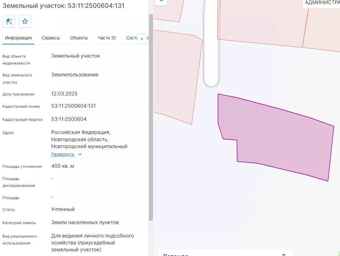Лот 3 - земельный участок из земель населенных пунктов с кадастровым номером 53:11:2500604:131, площадью 400 кв.м, расположенный по адресу: Новгородская область, Новгородский муниципальный район, Пролетарское городское поселение, рабочий поселок Пролетарий, улица Лесная, земельный участок 188р, разрешенное использование: для ведения личного подсобного хозяйства (приусадебный земельный участок), аренда сроком на 20 лет