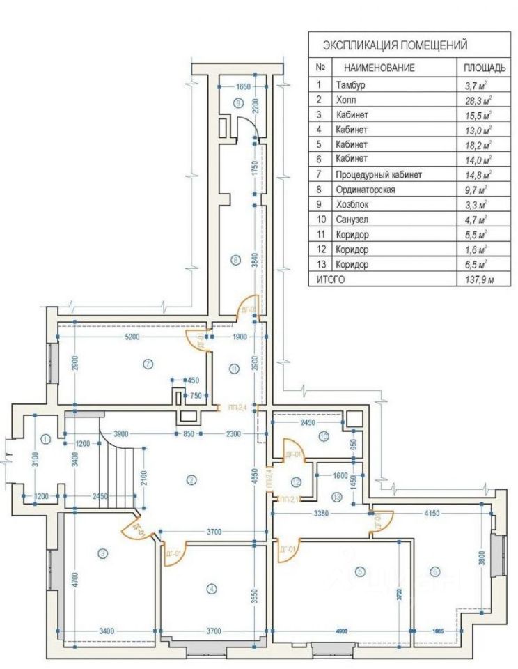 Планировка: 5 независимых кабинетов, каждый с мокрой точкой, холлл в котором расположена зона ресепшен, санузел, подсобное помещение, постирочная.
