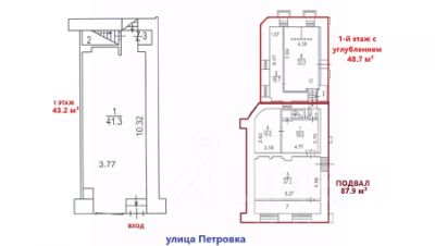 Помещение имеет три уровня: 1-й этаж 43.2 м², 1-й этаж с углублением 48.7 м² и подвал 87.9 м². Открытая планировка и витринные окна обеспечивают отличную видимость и возможность для индивидуального оформления пространства. Отдельный вход гарантирует удобство для клиентов и персонала. Высокие потолки 4 м создают ощущение простора и свободы. Электричество: 15 кВт. Налогообложение: УСН.