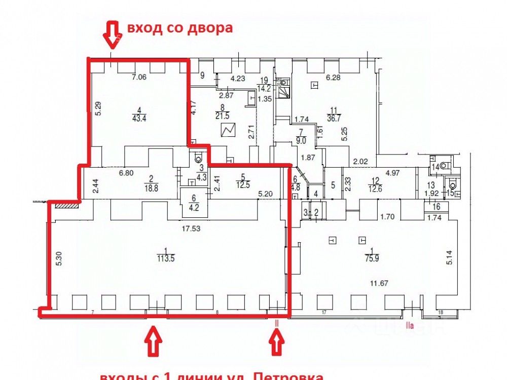 Над помещением располагаются 4 этажа апартаментов. 3 отдельных входа (2 с улицы, один со двора, для разгрузки-погрузки).